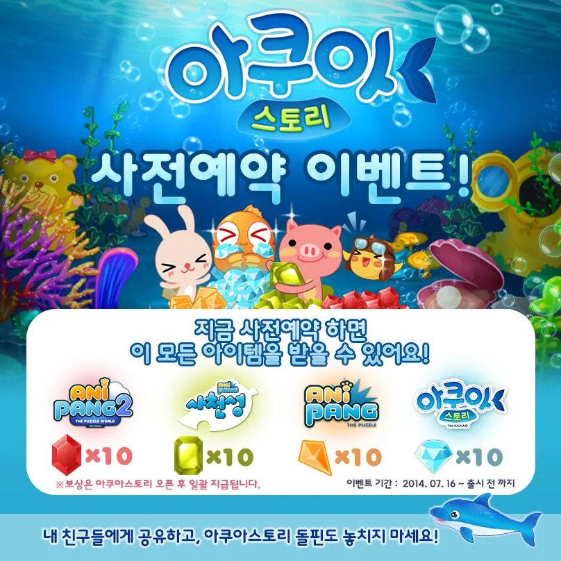 이번 아쿠아 스토리 사전예약은 애니팡2, 애니팡 사천성, 애니팡 및 SNS의 이벤트 페이지( aquastory-booking.stzapp.com )에서 가능하다. 휴대폰 번호를 입력하고 신청을 완료한 회원들은 아쿠아 스토리 런칭시 문자 서비스를 받게 되며, 이를 통해 아쿠아 스토리를 설치한 모든 회원들에게 애니팡2 루비 10개, 애니팡 사천성 페리 10개, 애니팡 토파즈 10개가 일괄 지급된다. 특히, 이벤트 페이지를 공유한 회원에 한해, 특별 돌핀 아이템을 특별 증정한다.
