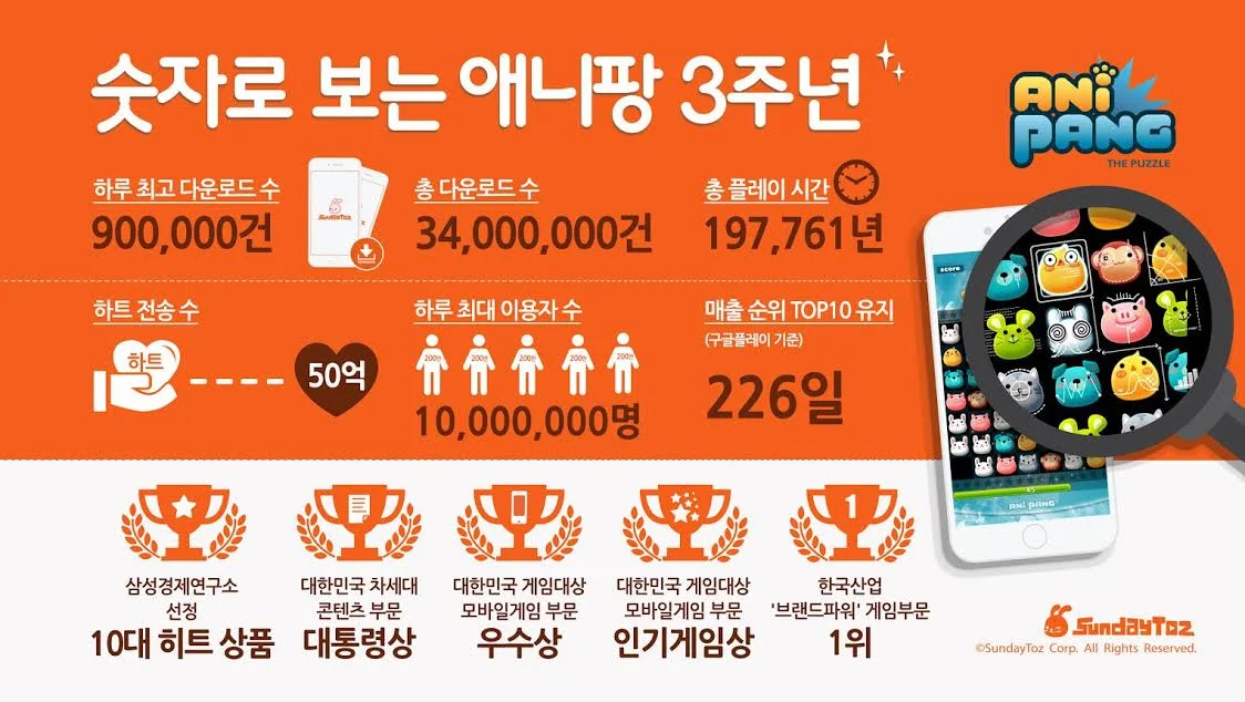 2012년 7월 30일, 첫 선을 보인 애니팡은 출시 직후, 하루 최대 90만 건의 다운로드를 기록하며 현재 3,400만 건이 넘는 다운로드를 기록하고 있다.
