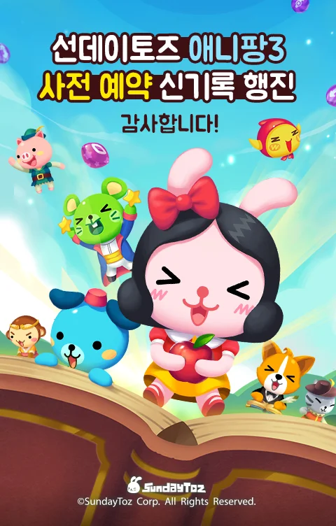 선데이토즈(대표 이정웅, www.sundaytoz.com)의 하반기 기대작 '애니팡3 for Kakao'가 사전 예약 3주만에 카카오 게임하기 사전 예약 부문의 신기록 행진을 이어 가고 있다.