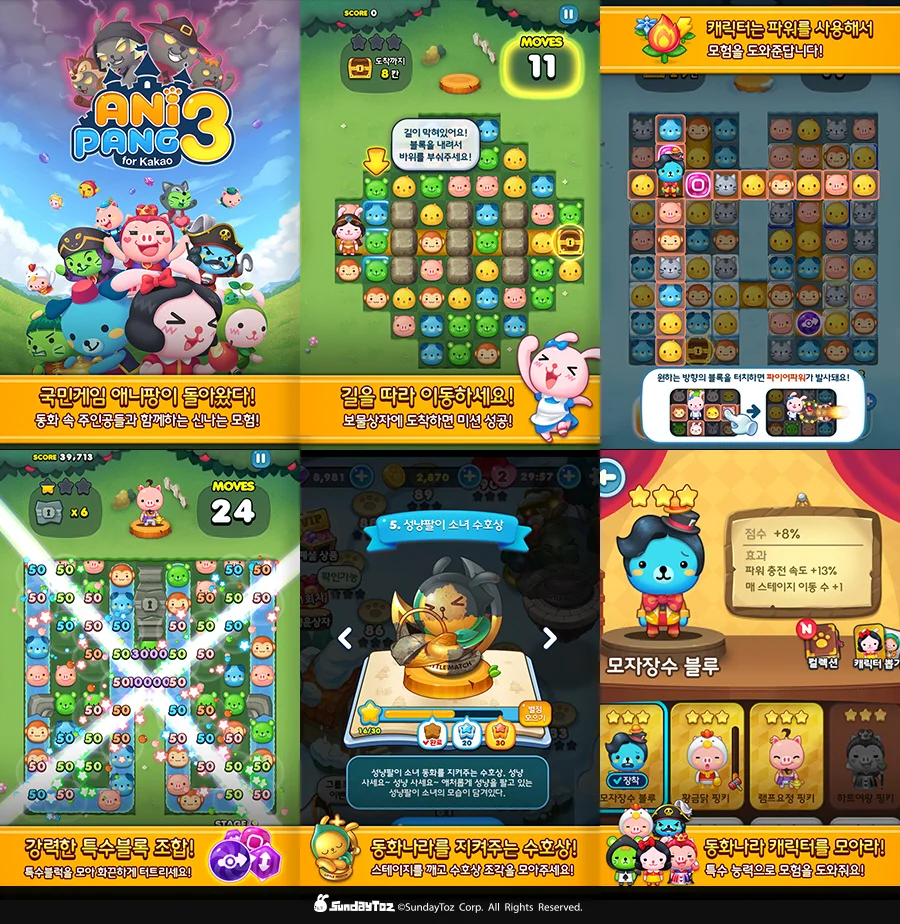 선데이토즈(대표 이정웅, www.sundaytoz.com)의 하반기 기대작 '애니팡3 for Kakao' 가 국내 주요 오픈 마켓에 27일 정식 출시되었다.
