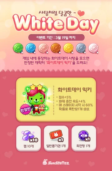 이번 이벤트는 각 스테이지 별로 나타나는 7가지 색깔의 사탕 블록 격파에 따라 다양한 게임 아이템을 제공하는 행사다. 사탕 30개 격파 시 증정되는 게임 내 유료 재화인 젬 10개를 시작으로 캐릭터 뽑기권, 회전팡 등 인기 아이템을 증정해 이용자들의 재미를 더할 전망이다. 특히 사탕 블록 300개를 격파 시, 폭탄팡을 만들어주는 한정판 캐릭터인 화이트데이 믹키는 이용자들의 관심을 인기를 얻을 것으로 기대를 모은다. 또한 사탕 블록 격파 이벤트는 '애니팡3'를 통해 선데이토즈의 새로운 이용자층으로 자리매김하고 있는 10대와 20대 등 젊은 이용자층이 즐길 맞춤형 이색 콘텐츠가 될 것이라는 게 회사 측의 설명이다.