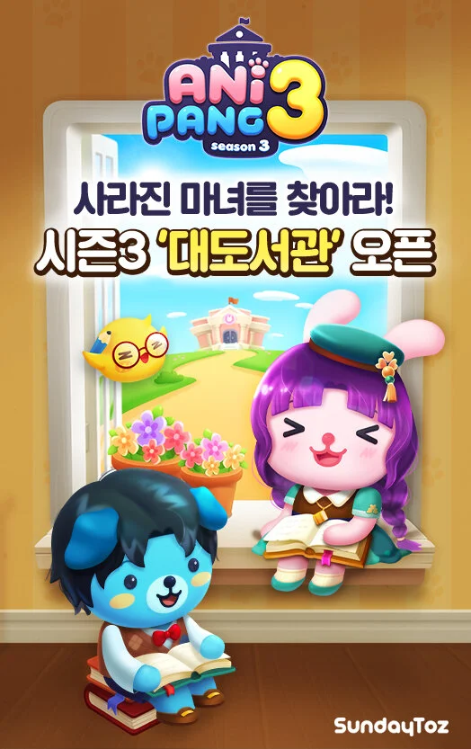 선데이토즈(대표 김정섭, www.sundaytoz.com)가 모바일 퍼즐 게임 '애니팡3'의 세 번째 시즌으로 '대도서관' 업데이트를 진행했다고 8일 밝혔다.