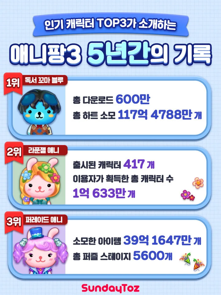 애니팡 시리즈 최초로 캐릭터 수집과 고유 스킬 시스템을 선보인 ‘애니팡3’의 IP기반 캐릭터 관련 기록도 관심을 모은다. 총 417종의 애니팡 캐릭터들을 선보인 ‘애니팡3’에서 이용자들이 수집한 캐릭터는 1억 600만여 개이며, 사용 빈도가 가장 높은 캐릭터는 점유율 9%를 기록한 독서꼬마 블루로 조사됐다. 독서꼬마 블루는 빠른 충전 속도와 지속적인 하트 추가 등의 특수 기술을 가진 캐릭터로 다양한 퍼즐 스테이지에서 사용할 수 있어 선호도 1위를 차지했다. 이외에도 라푼젤 애니, 퍼레이드 애니는 고유 스킬과 디자인에 대한 호평 속에 선데이토즈가 집계한 이용자들의 인기 캐릭터 2위와 3위에 이름을 올렸다.