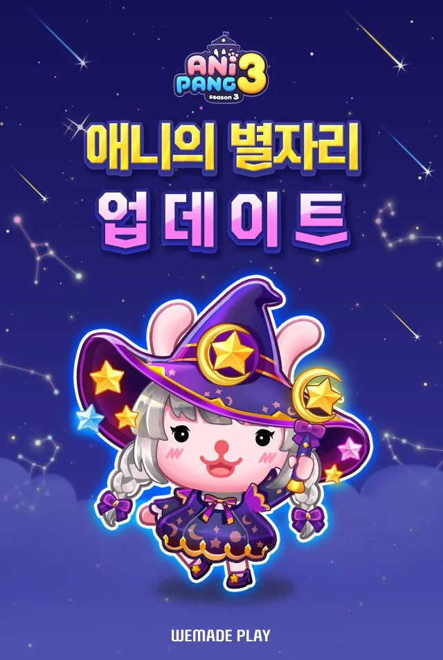 ㈜위메이드플레이(대표 이호대)는 자사 모바일 게임 '애니팡3'에 신규 콘텐츠 '애니의 별자리'를 업데이트하고 기념 이벤트를 진행한다고 7일 밝혔다.