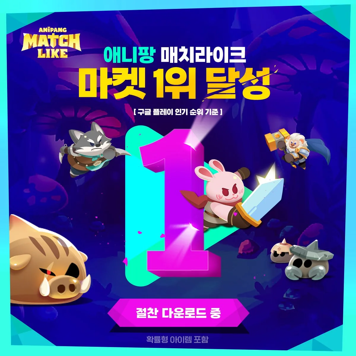 구글 플레이 인기 1위 소식을 전한 ‘애니팡 매치라이크’는 퍼즐 플레이와 애니팡 프렌즈 육성을 통해 몬스터와 대전하는 RPG결합 퍼즐게임으로 구글 플레이와 애플 앱스토어에서 무료로 다운로드할 수 있다.